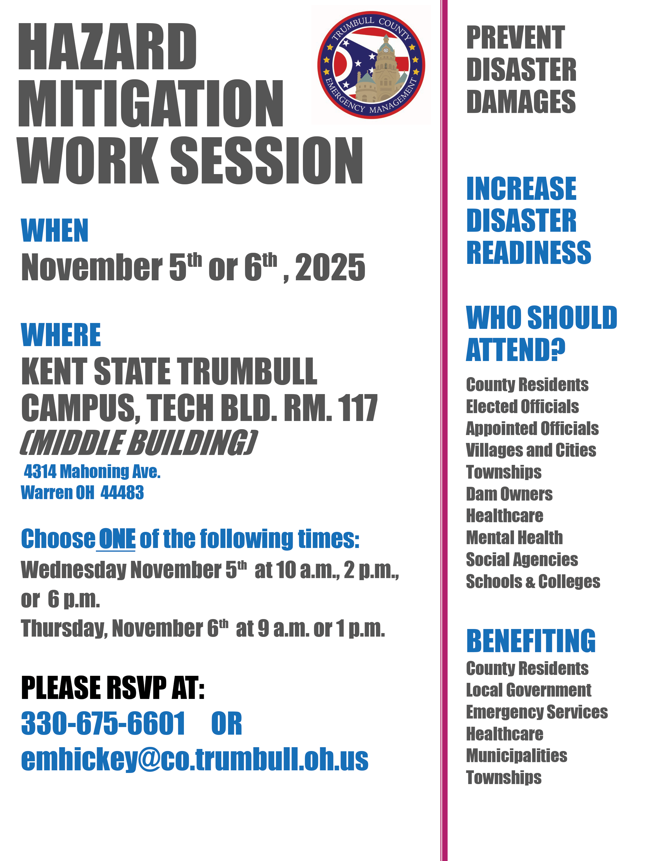 Welcome to Trumbull County Emergency Management Agency! Our mission is to provide a coordinated and efficient response to emergency situations and disasters, ensuring the safety and well-being of the communities we serve. Our team of trained professionals is equipped to handle a wide range of emergency scenarios, from natural disasters to man-made crises. We work closely with local and state agencies to develop and implement effective response and recovery plans, and provide critical support to affected individuals and communities. When emergencies arise, we are here to provide reliable information, resources, and support to help our communities stay safe and recover quickly.