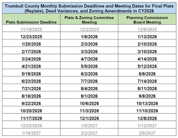 The Trumbull County Planning Commission provides community planning and zoning assistance to the unincorporated areas of Trumbull County on a wide variety of issues. These services include: Administration of Subdivision Regulations for all Townships, Subdivision of Land Information and Processing, Site Plan Reviews and Recommendations, Zoning Text and Map Amendment Reviews.